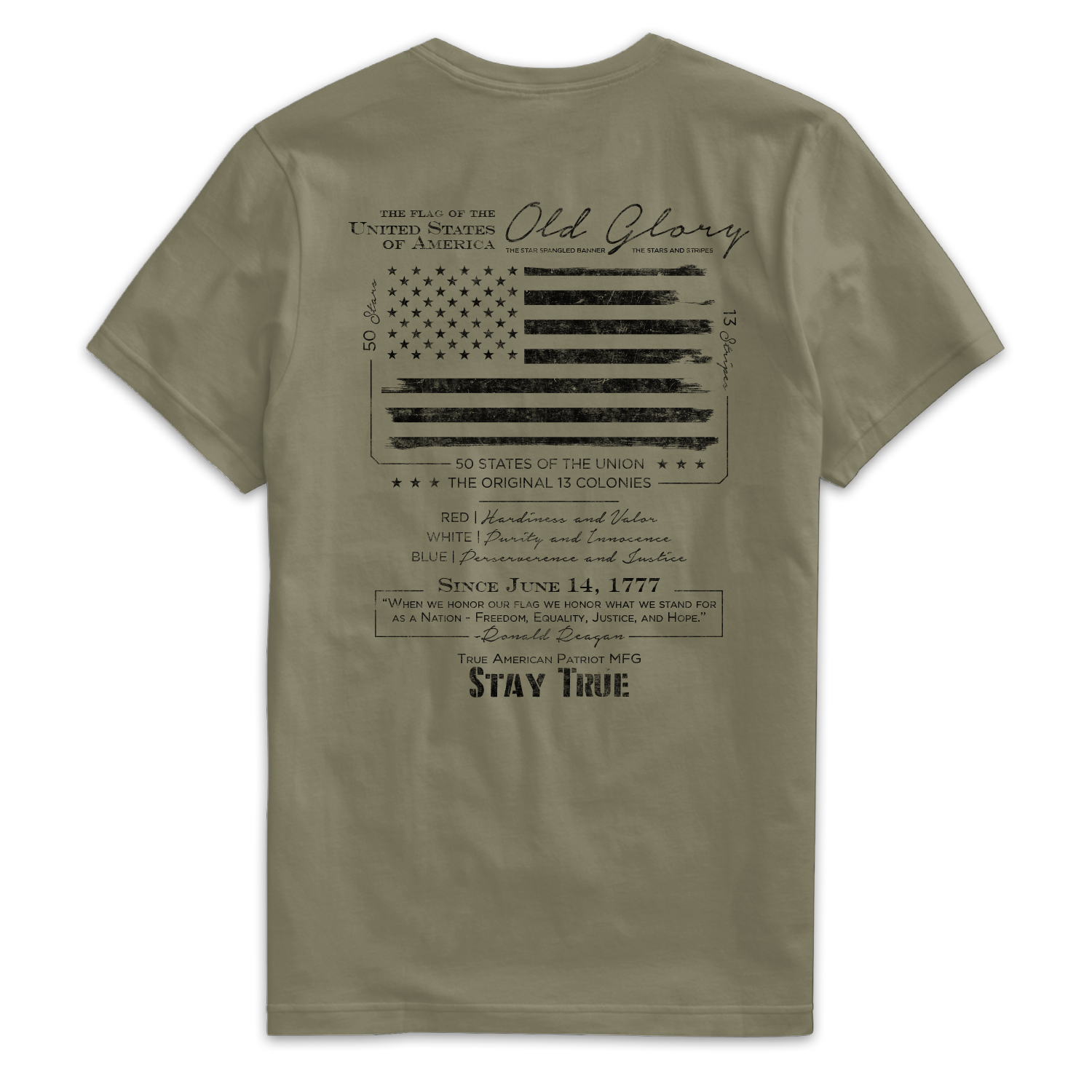 The Old Glory Blackout – Stay True Tee from True American Patriot Mfg. is a tribute to the history, meaning, and sacrifice behind the American flag. Featuring a distressed, vintage-style flag graphic paired with historical details about its colors, stripes, stars, and origin, this design elevates the symbol of freedom into a bold, wearable statement.
